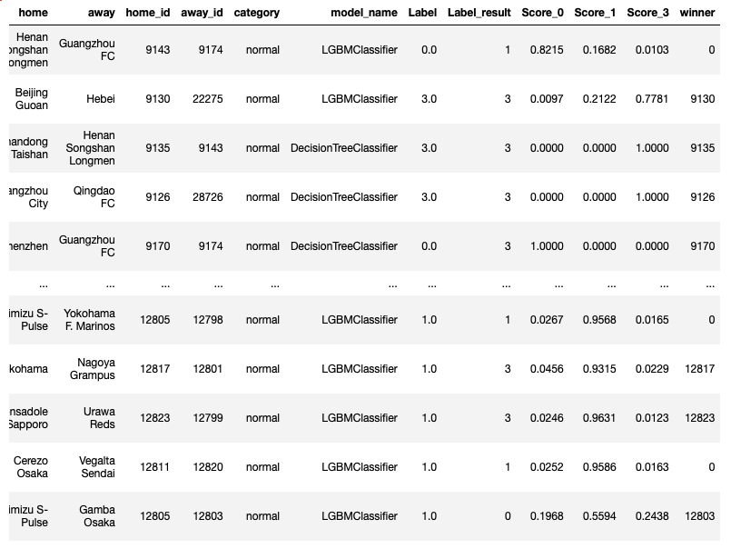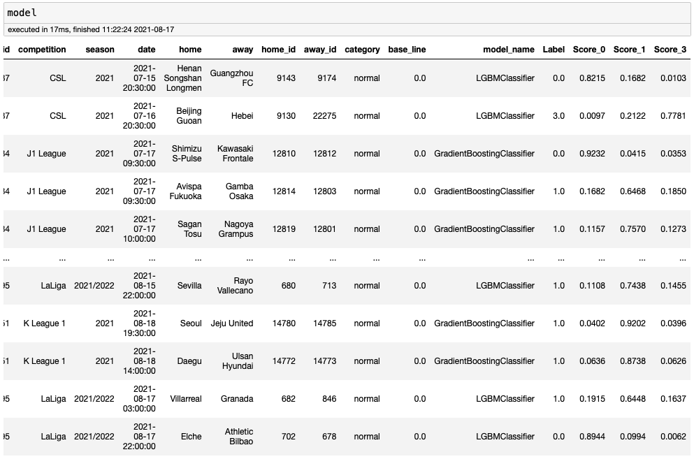 일단 현재까지 적중률을 확인해보고, 앞으로는 적중률을 매 주 확인할 수 있도록 하는 코드를 함께 짜러 가봅시다! 먼저 model 테이블과 경기 일정과 결과를 보여주는 match_info 테이블을 주피터로 가져와서 확인해보도록 해요.