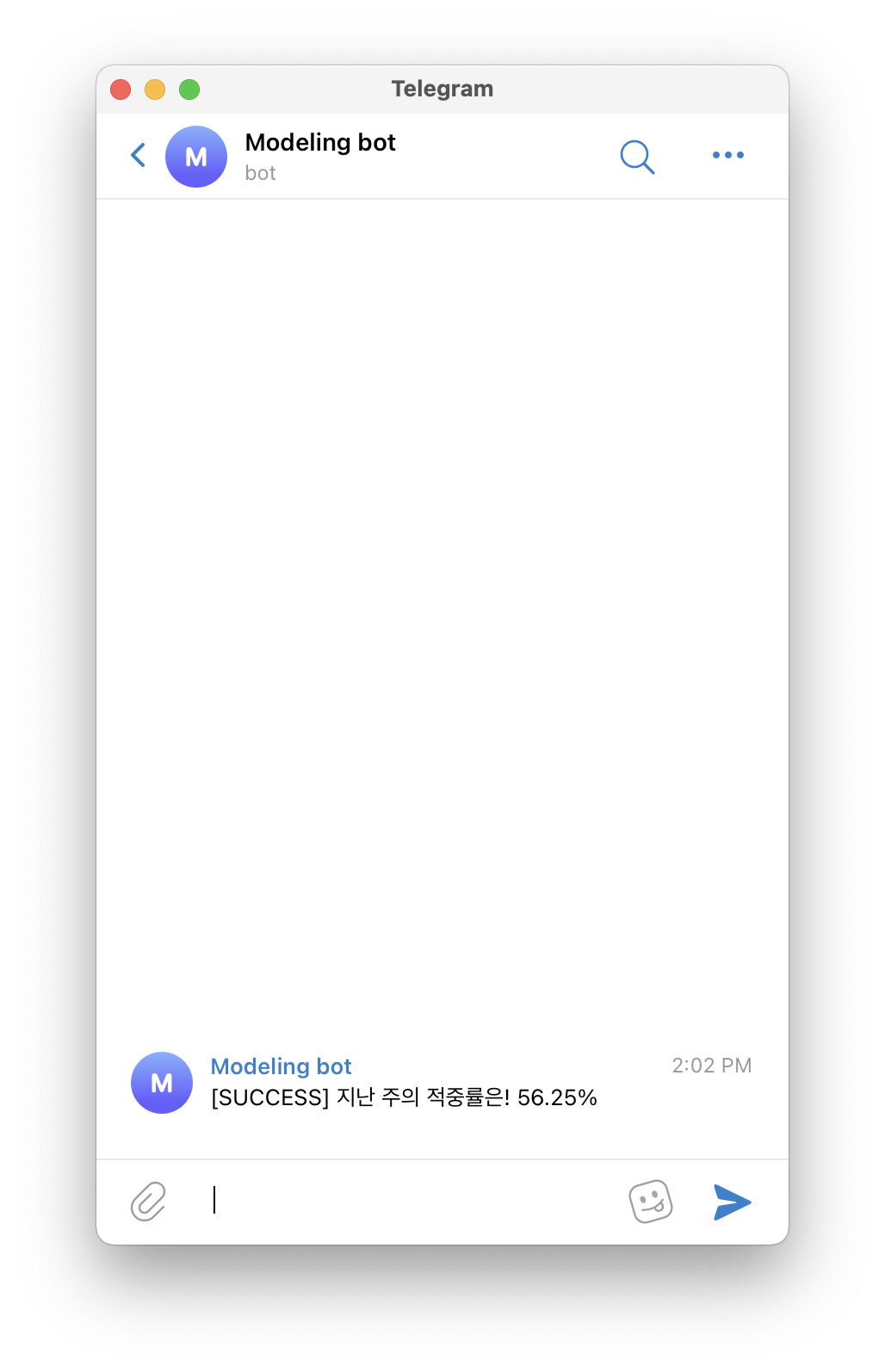 저는 앞서 말했듯이 매주 월요일, 한 주간의 적중 결과를 확인하는 코드를 짤 예정이라 위의 코드를 한 셀에 모두 정리해서 넣었구요, if문을 활용해서 매 주 월요일에만 코드가 돌아가도록 했어요. 추가로, 원래 코드가 잘 돌아가는지 확인용이었던 텔레그램봇을 활용해서 적중률을 구하도록 했어요! 예를 들면 이렇게 확인할 수 있답니다!