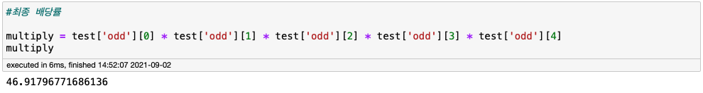 짠! 이렇게 5개가 조합되었네요. 만약, 이렇게 5경기를 구매한다면 약 몇배의 배당률을 받을 수 있을까요?