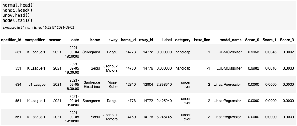 여기서 확률이란, Classification으로 돌렸을 때 나오는 Score를 기준으로 했어요. 따라서 Regression으로 돌리는 언더오버는 확률을 알 수 없기때문에, 조합에는 들어가지 않는답니다!