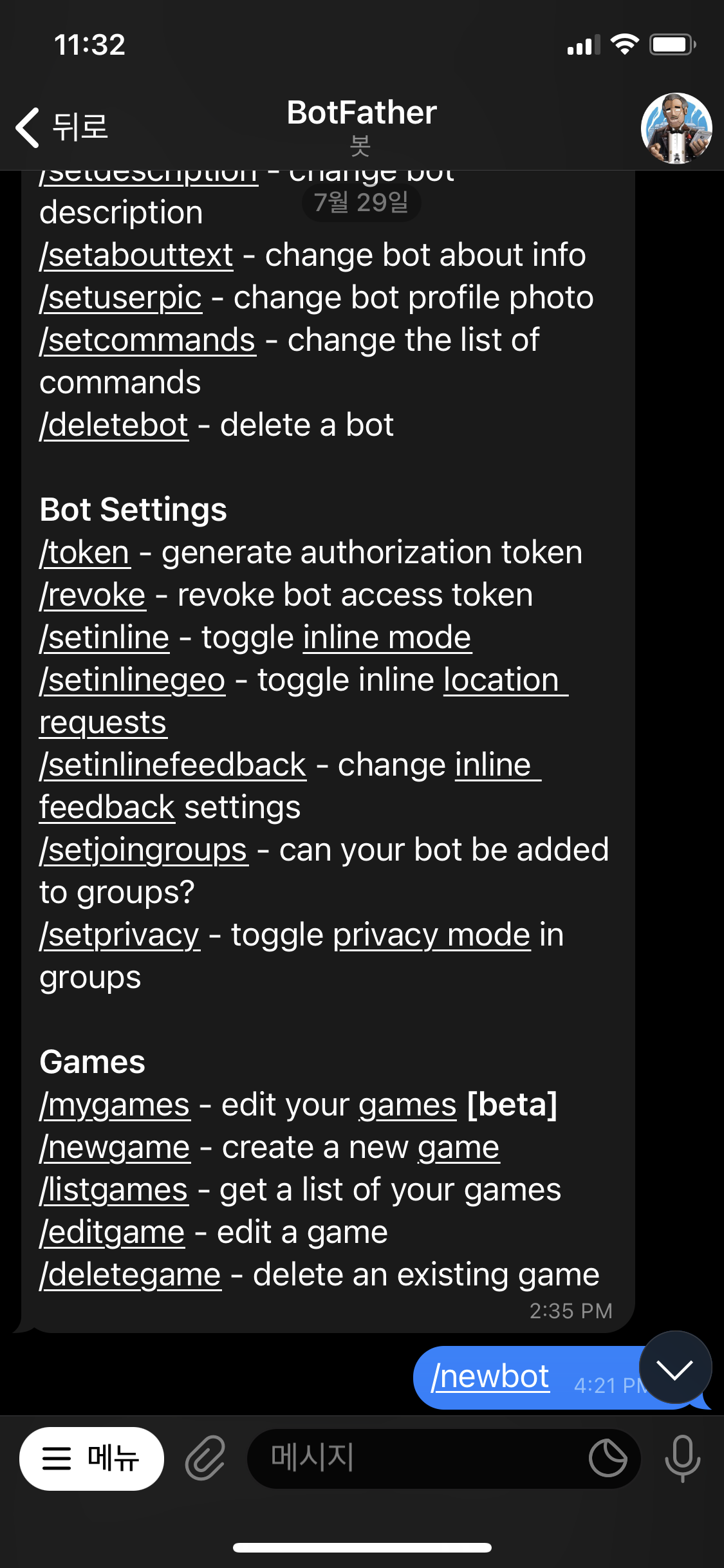 저는 새로운 봇을 만들것이기 때문에 /newbot 을 쳐주면,