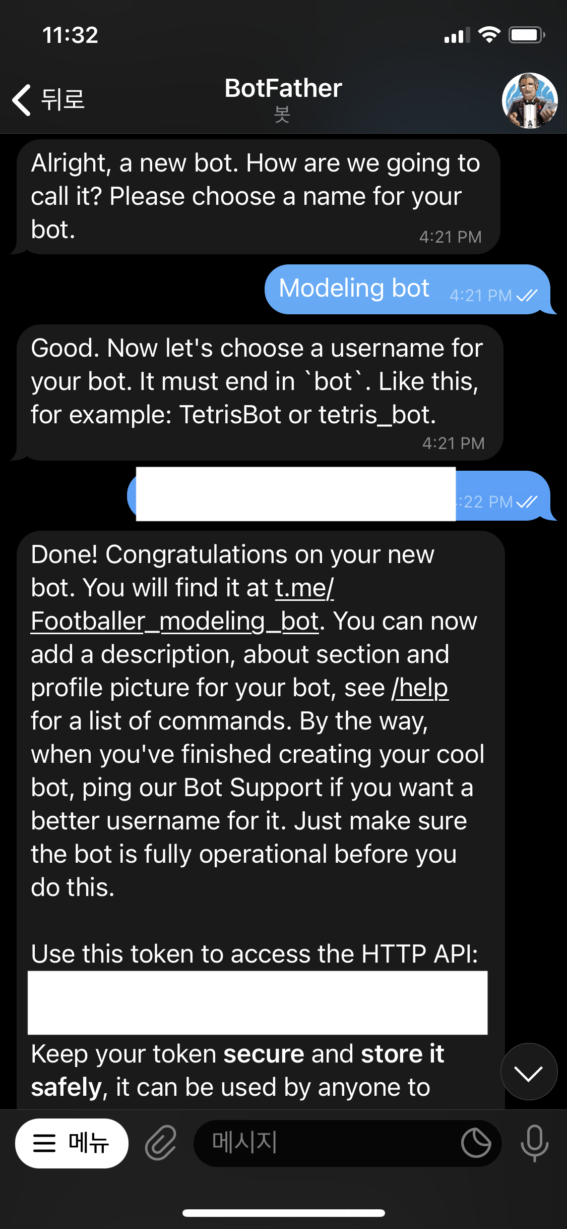 이렇게 이름을 설정할 수 있는 메세지가 옵니다! 이름을 두번 설정하게 하는데, 첫번째 입력하는 이름은 봇의 이름, 두번째 입력하는 이름은 그 봇의 계정명이라고 생각하면 될 것 같아요. 이렇게 이름을 설정하면 HTTP API 라는걸 알려주는데, 봇을 만들 때 꼭 필요한 키 이기 때문에 꼭 잘 알아두셔야 합니당! 보안을 위해 혹시 몰라 저도 가려놓았어요ㅎㅅㅎ